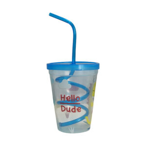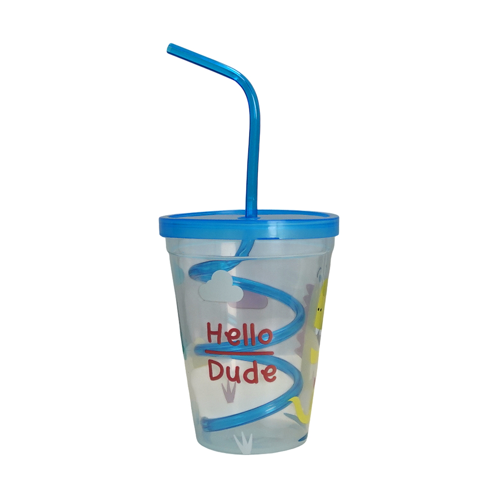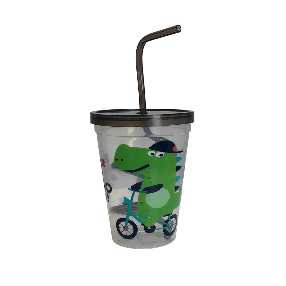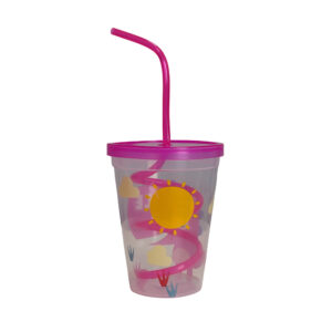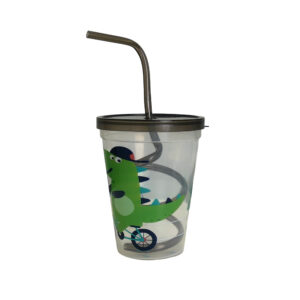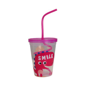 Vaso de 400ml con pitillo decorado con dinosaurios en colores rosado, azul y transparente.