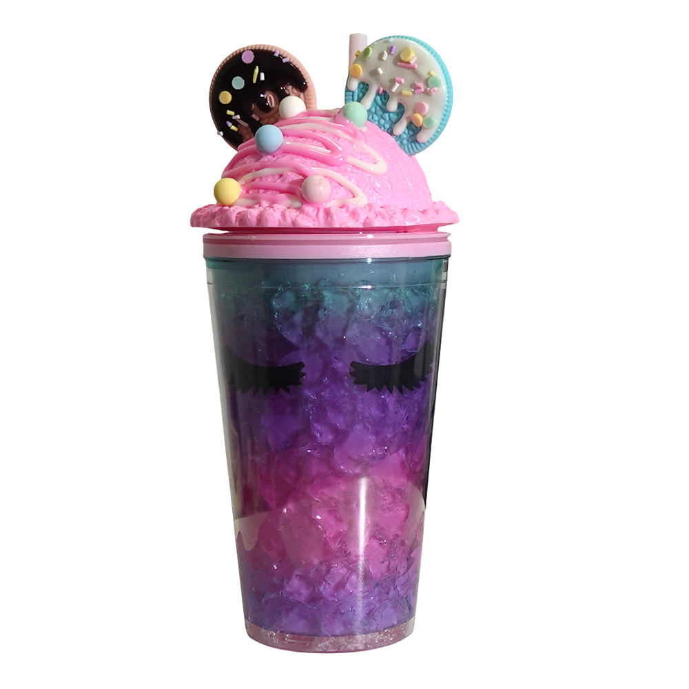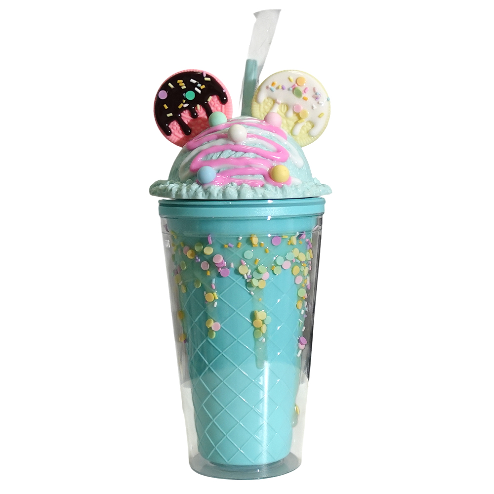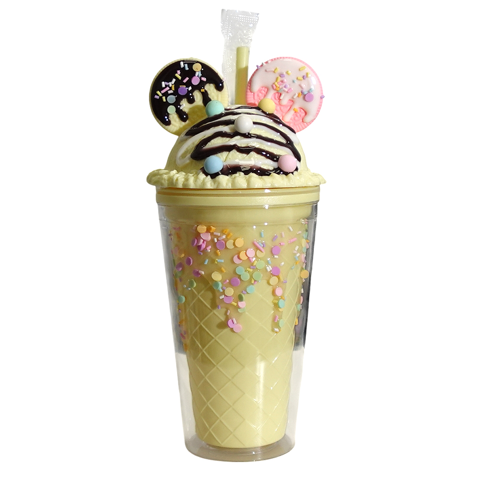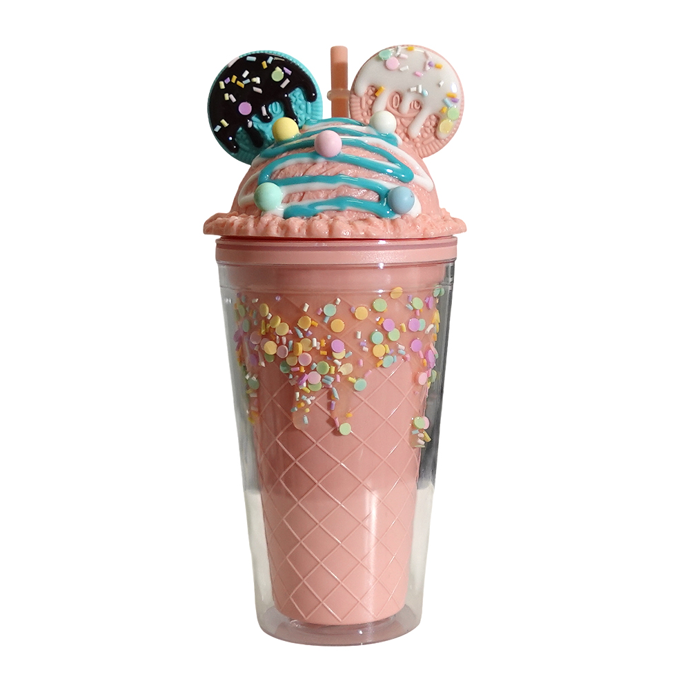 Vaso plástico con tapa decorada estilo helado y pitillo, en colores variados.