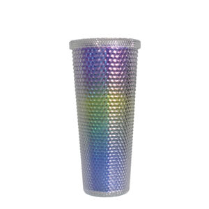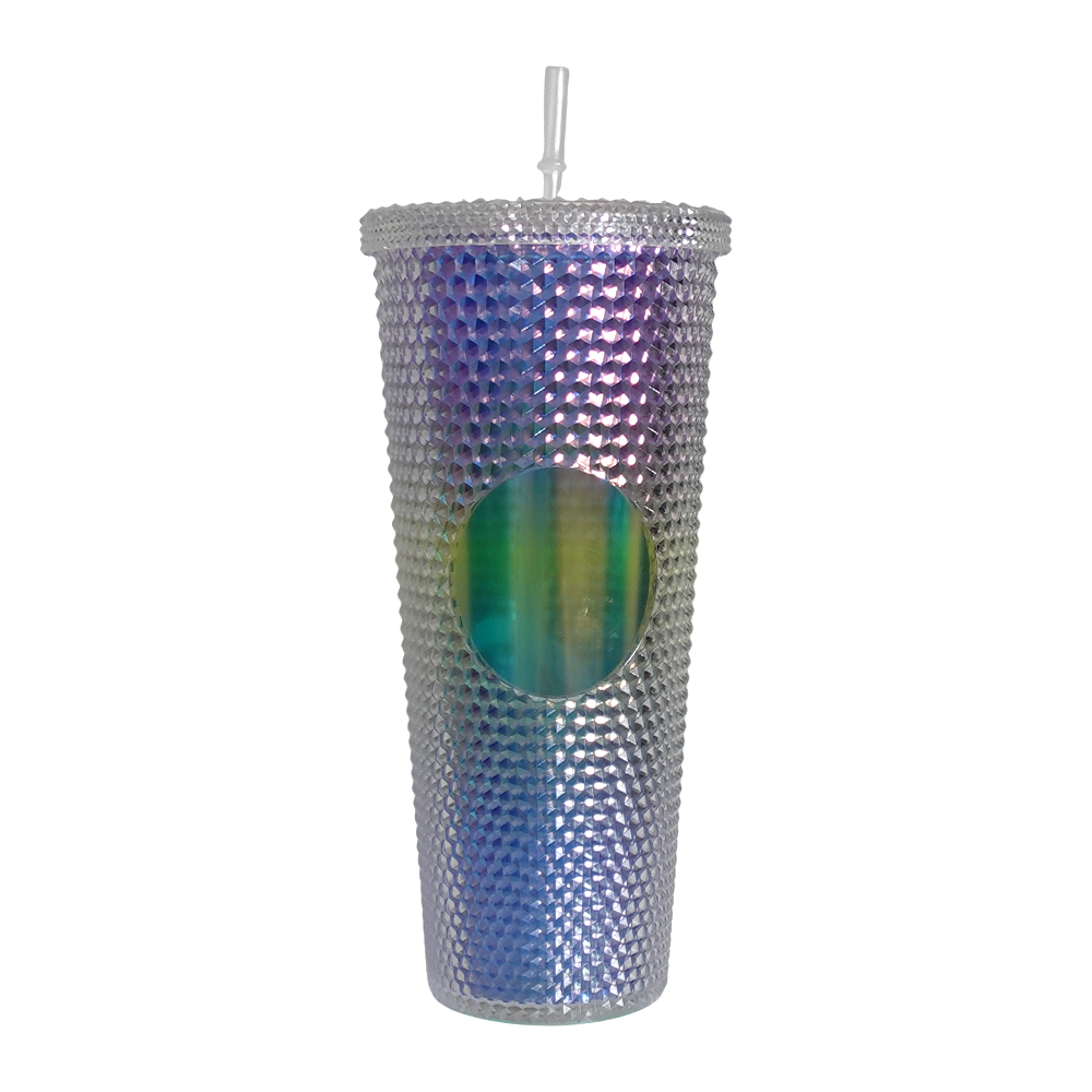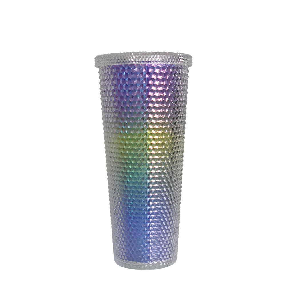 Vaso térmico largo de 750ml con tapa y pitillo, colores degradados con textura llamativa.