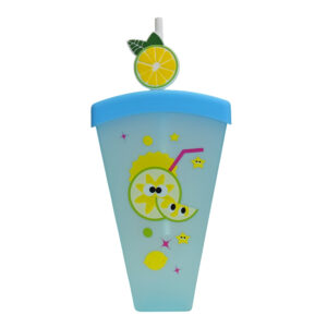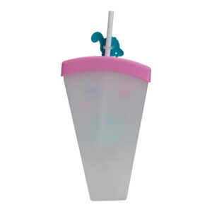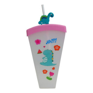 Vaso triangular con pitillo y tapa, diseños animados de dinosaurio, oso y limón en colores variados.